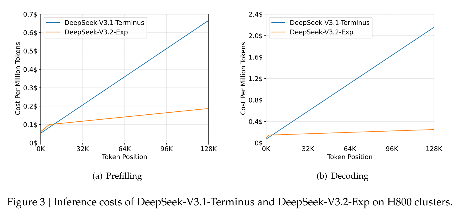 - Drastic Cost Reduction: Figure 3 from the paper is conclusive. It shows how the cost per million tokens—for both prefilling (processing the initial prompt) and decoding (generating the response)—skyrockets linearly for the older model as the context length increases. In contrast, with DSA, the cost curve flattens dramatically, demonstrating massive savings in long-context scenarios.